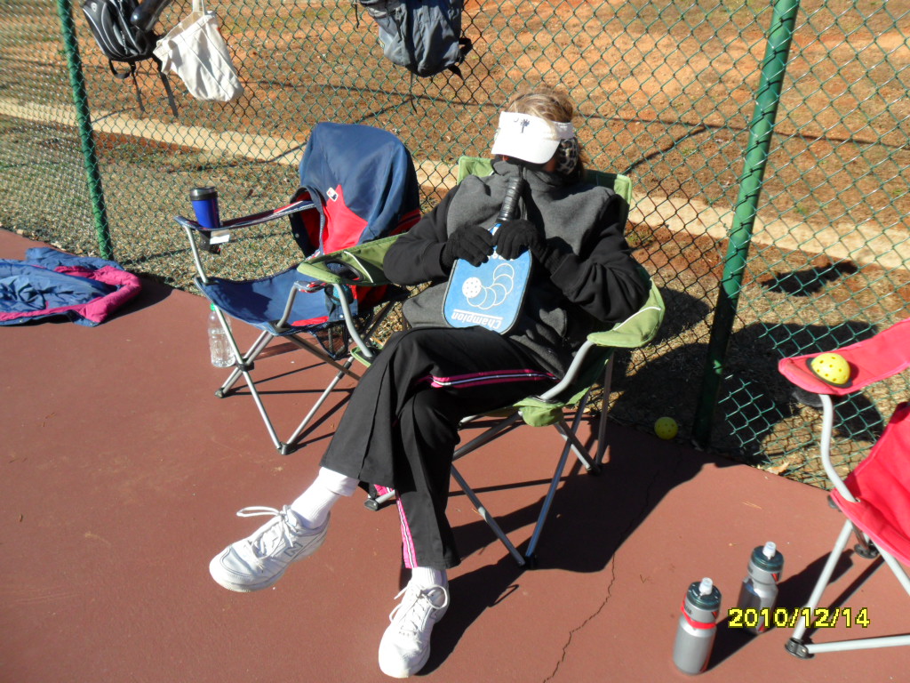 Six players didn't quite fill the courts, so we played doubles on one court and half-court singles on the other. There were a lot of missed balls because Spidy wasn't here to direct his partners: "you got, I got, we both got, who got?" But, we carried on for 1-1/2 hours. Taking breaks was a chilly affair (that's Jan below - bundled up).