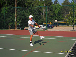 We rotated on the courts and everyone one played with everyone, or - someone played against someone - can't remember which, though. Above: Bob T shows off his fancy footwork. Below: Jan in action.Below: Hoot and Gary.